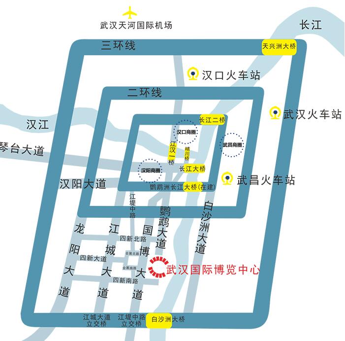 機場大巴漢口線——至民航小區(qū)下車步行約300米至長青公園公交車站換乘704路——至鸚鵡大道新五里路一路下車步行至國博中心。