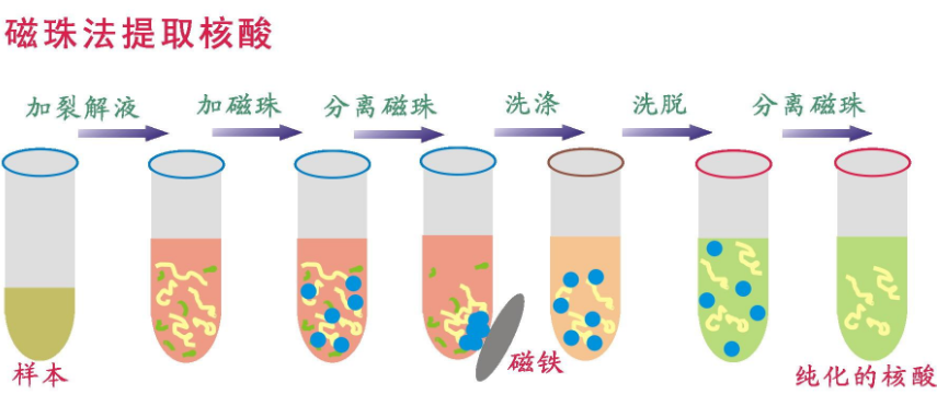 隨著冬季疫情在多地零星爆發(fā),作為新冠篩查“金標(biāo)準(zhǔn)”的核酸檢測,成為了疫情防控的關(guān)鍵,盡快完成大量人員核酸檢測,收治確診病例成為防控疫情的重中之重,作為提取核酸的全自動(dòng)核酸提取儀,你知道它是怎樣實(shí)現(xiàn)全自動(dòng)化檢測,原理是怎樣的嗎? 目前,市場上的全自動(dòng)核酸提取儀主要都是采用磁珠法,一般包括裂解、結(jié)合、洗滌、洗脫四個(gè)主要步驟。如下圖: