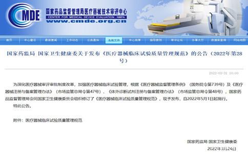 2022年3月31日,為深化醫(yī)療器械審評審批制度改革,加強(qiáng)醫(yī)療器械臨床試驗管理,根據(jù)《醫(yī)療器械監(jiān)督管理條例》(國務(wù)院令第739號)及《醫(yī)療器械注冊與備案管理辦法》(市場監(jiān)管總局令第47號)、《體外診斷試劑注冊與備案管理辦法》(市場監(jiān)管總局令第48號),藥品監(jiān)督管理局會同衛(wèi)生健康委員會組織修訂了《醫(yī)療器械臨床試驗質(zhì)量管理規(guī)范》,現(xiàn)予發(fā)布,自2022年5月1日起施行。
