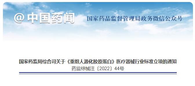 4月26日藥監(jiān)局綜合司4月24日發(fā)布的關(guān)于《重組人源化膠原蛋白》醫(yī)療器械行業(yè)標(biāo)準(zhǔn)立項(xiàng)的通知(以下簡稱《通知》)顯示,《重組人源化膠原蛋白》醫(yī)療器械行業(yè)標(biāo)準(zhǔn)制修訂項(xiàng)目立項(xiàng)已批準(zhǔn)。